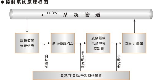 在自動控制柜內(nèi)設有獨立的動力電源,由所對應的電源開關控制,采用變頻控制器和數(shù)顯PID調(diào)節(jié)器或PLC對計量泵電機進行控制, 通過帶電氣和機械互鎖的轉(zhuǎn)換開關及中間繼電器實現(xiàn)三種工作狀態(tài):自動、半自動、手動控制模式。在自動控制模式下,數(shù)顯PID調(diào)節(jié)器或PLC接收來自取樣分析儀表變送器輸出的4-20mA信號,根據(jù)用戶要求的指標設定值經(jīng)PID運算后輸出調(diào)節(jié)型4-20mA信號調(diào)節(jié)變頻器的頻率輸出,完成對計量泵電機轉(zhuǎn)速的閉環(huán)自動控制。在半自動控制模式下,計量泵的控制脫離外部儀表信號的閉環(huán)控制,操作人員可直接調(diào)節(jié)變頻器的電位計調(diào)節(jié)旋紐實現(xiàn)對計量泵電機轉(zhuǎn)速的控制。在手動控制模式下,計量泵電機的運行狀態(tài)脫離了變頻器輸出的控制,完全是在交流工頻三相電源直接供電的形式下運行,對計量泵流量的調(diào)節(jié)依靠手動調(diào)節(jié)計量泵的沖程調(diào)節(jié)手柄來實現(xiàn)??刂葡到y(tǒng)中采用的PID數(shù)字顯示調(diào)節(jié)器或PLC還可以實現(xiàn)對測量指標效果的動態(tài)監(jiān)視。